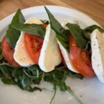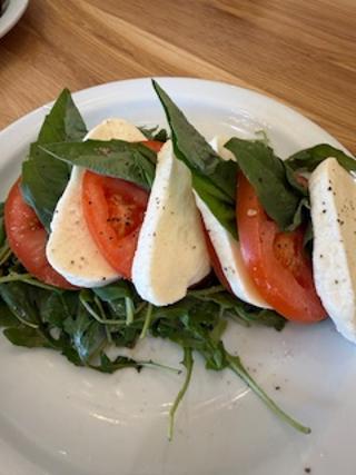 Caprese Salad, with fresh mozzarella, Himalayan Sea Salt, freshly cracked pepper on a bed of arugula threshold, and basil served with a balsamic vinaigrette dressing. Lots of fresh cheese and lovely tomatoes, making this salad a real keeper.