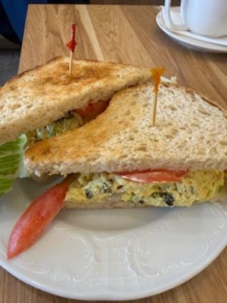 Chicken Curry Sandwich, with all white meat, chicken, and a light curry dress seasoning with scallions, fresh tomato, and lettuce. This is a must have sandwich, the curry flavor is light and wonderful. The best part is the raisin bread that they put it on.