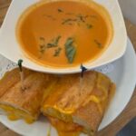 Tomato Basil Soup, with fresh basil, and as a grilled cheese baguette, with cheddar cheese and grilled tomatoes. This very special combination; it was just so luscious, I would order this every time.
