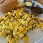 The Scramble, with three eggs scrambled, chives, bacon, a freshly baked baguettes, butter, and orange marmalade preserve. The bread with the eggs really makes this so amazing.